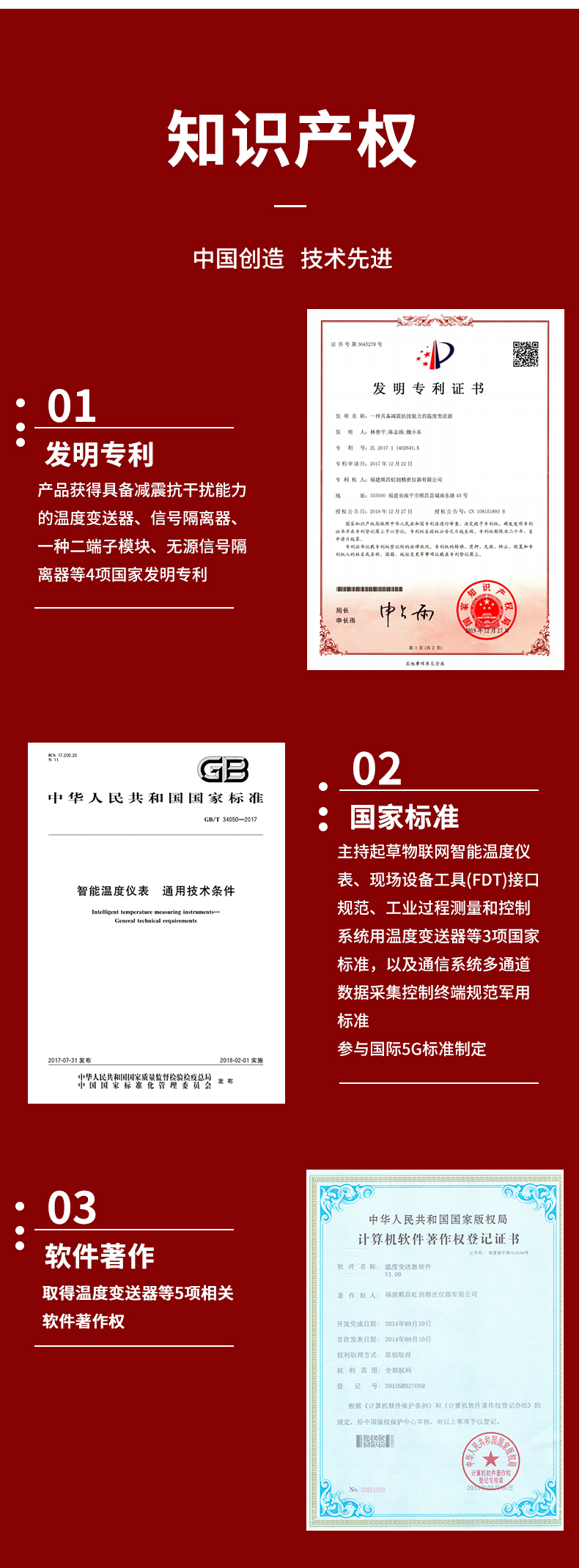 虹潤公司是專業(yè)生產(chǎn)溫度變送器的國家專精特新“小巨人”企業(yè)。生產(chǎn)的溫度變送器,具有采用磁隔離技術,配套編程器可修改參數(shù),抗干擾能力強,穩(wěn)定性好,帶RS485或HART通訊等特點。該產(chǎn)品不僅通過HART基金會認證、德國萊茵 CE 認證與 SIL 功能安全認證,還獲得具備減震抗干擾能力的溫度變送器、信號隔離器、一種二端子模塊、無源信號隔離器等4項國家發(fā)明專利,主持起草物聯(lián)網(wǎng)智能溫度儀表、現(xiàn)場設備工具(FDT)接口規(guī)范、工業(yè)過程測量和控制系統(tǒng)用溫度變送器等3項國家標準,以及通信系統(tǒng)多通道數(shù)據(jù)采集控制終端規(guī)范軍用標準,參與國際5G標準制定,取得溫度變送器等5項相關軟件著作權。產(chǎn)品廣泛應用于石油、電力、化工,冶金、制藥、紡織、橡膠制造等工業(yè)領域現(xiàn)場自動化測溫過程。